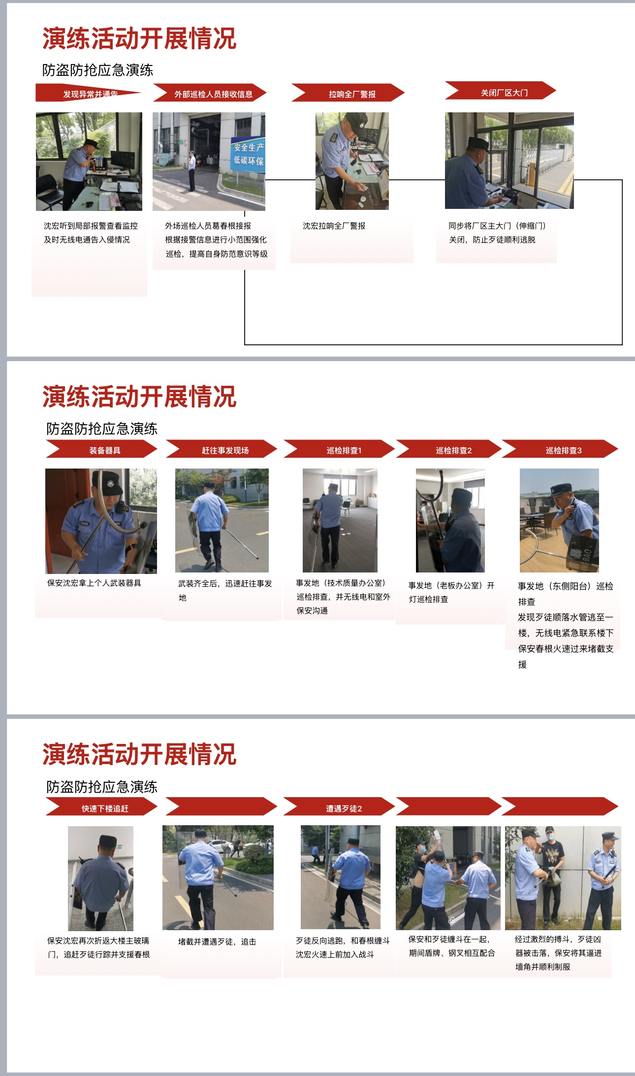 5月29日,公司组织了防盗防抢现场演练活动,员工积极参与,通过实战演练提高安保人员对不良分子的对抗能力,提高安保人员的应急处理能力。